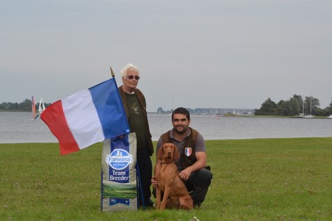 2ème jour, c'est la Coupe d'Europe, les choses sérieuses commencent et Aldas est en très grande condition. Elle sort du camion en pleine forme, petit calin avec son papa avant le départ, on ne change pas un rituel qui gagne !!! Luciano demande aux juges s'il peut commencer par faire la bordure, très peu d'oiseaux ont été vus jusqu'à présent et il est peu convaincu qu'ils se trouvent en plein milieu des betteraves. Les juges sont perplexes et l'envoie plutot dans le champs de betteraves ... heureusement Aldas est grande, est bien déterminée à trouver les oiseaux, elle prend beaucoup de terrain et est en parfaite harmonie avec son conducteur ... qui l'envoie faire la bordure !!!! Elle prendra un magnifique point sur compagnie, parfaitement sage à l'envol, c'est du grand travail !! Les juges sont enchantés et demandent à faire le rapport à froid qui sera exécuté à la perfection par Miss Dadach !! Ils félicitent Luciano, le remercient pour ce spectacle et décident d'en arrêter là ils en ont assez vu!! Aldas et Lulu rentrent au camion sous les applaudissements du public, un grand moment d'émotion !!! Elle remportera le CACT puis la RCACIT au barrage. Que du bonheur ....